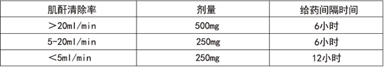 未接受透析的患者:下面的给药原则以500mg/次、每6小时给药1次的给药方案为基础,根据肌酐清除率的不同进行的调整。在实际使用过程中,由于剂型的选择及患者个体的不同,可能需要对给药方案进行进一步的调整。